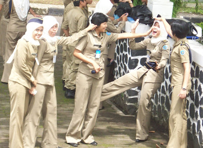 Hm, selama ngampus di kesatriaan, belum pernah saya dapat barak sekompak dan segila ini. Pernah sekali, dah mati-matian beresin barak untuk lomba. Semuanya harus dan sudah sesuai PERDUPRA, tapi tenyata kalah dan dapat bendera hitam, padahal sumpah dah kinclong abis tuw lantai bis di MAA. Tapi bukan itu masalah utamanya, ternyata selain dapat bendera hitam, hukumannya cabut pesiar (ini berarti bye-bye dunia luar) dan mesti laporan sepanjang hari setiap jamnya. Tapi lucunya, ne barak alien malah ubah total si cabut pesiar jadi ajang PDL Ceria. Beres apel pelepasan pesiar langsung baris rapi tuk laporan ma perwira jaga. (Pake semangat 45, mpe perwira jaga geleng2). Beres laporan pertama, langsung pada tandingan ngambil buah kersen di samping menza (tempat makan praja), pake acara manjat pohon pula. ckckckck.. putri???